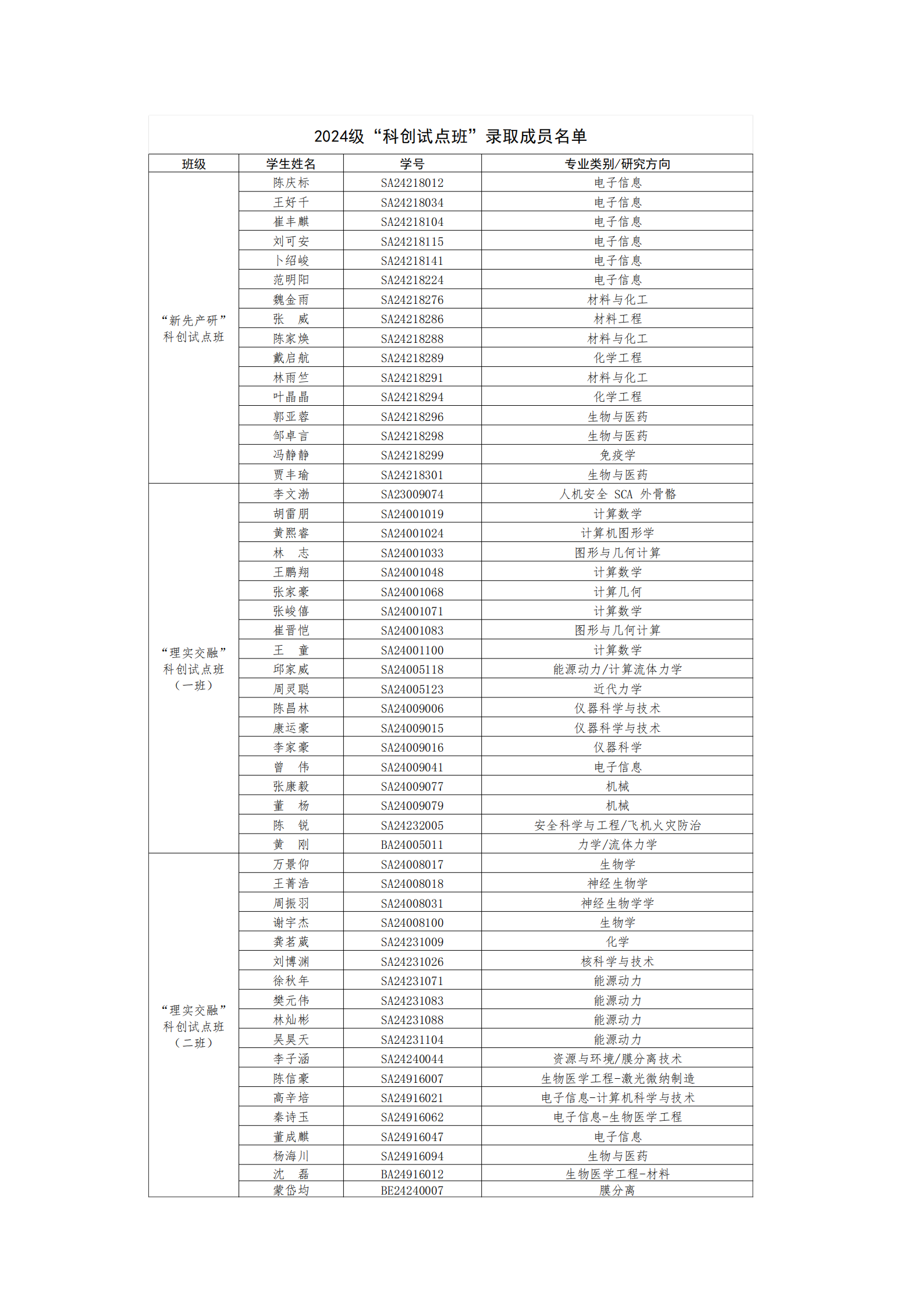 关于公布2024级“科创试点班”录取名单的通知
